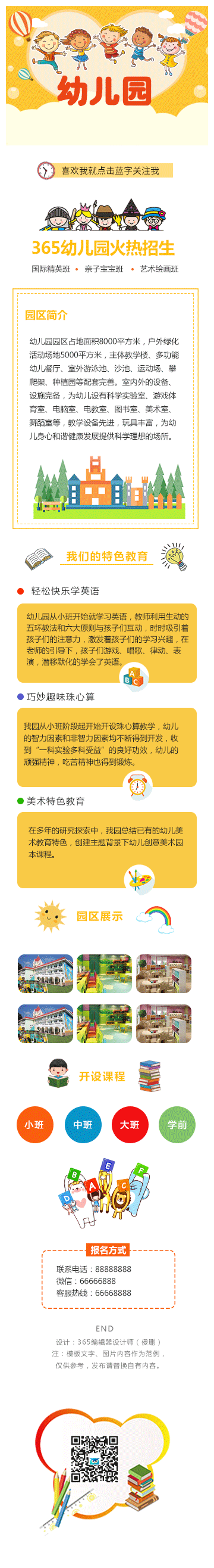 推荐理由:教育类型的招生活动最适合多图展示,卡通可爱的动态元素体现行业性质,吸引家长读者更直观地感受幼儿园的特点。