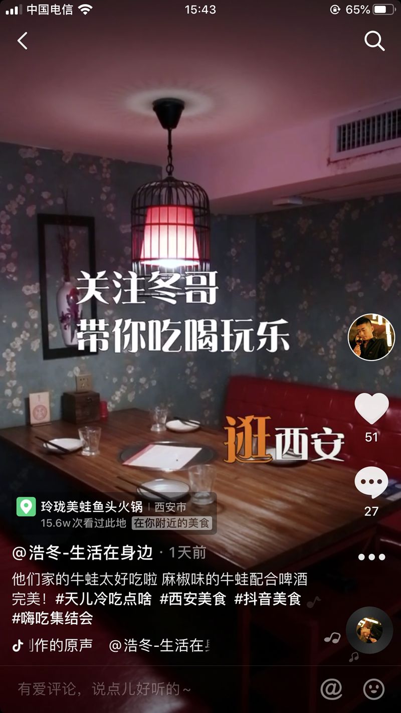 官宣 淘喜坊官方抖音号 浩冬逛西安开通以来 受到各位粉丝欢迎 报道吃喝玩乐 浩冬带大家抖起来 我们用 接地气、最真实、 各个作品介绍给大家 让你们近距离接触西安的美食、娱乐等等 一起用短视频记录我们身边的生活 抖音如何查询美食位置 很多抖音的朋友 都在问询美食或商家的位置 那小编就介绍给大家 首先打开抖音美食 点击左下角(黄色框内) 美食名称 选择任意一个地图 你就可以按照 导航前往目的地了 学会了吧! 进入抖音首页,点击左上角 “搜索” xahd520 或“搜索” 浩冬逛西安 扫描下方而二维码 或者保存下图 打开抖音 自动识别点击关注 感谢你相伴 这一次 让我们在抖音遇见 一起期待更加精彩的未来 让我们一起抖起来 关注冬哥 带你吃喝玩乐 逛西安